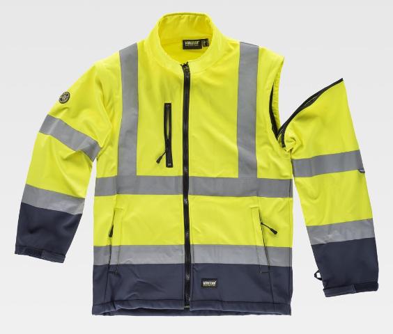 Parka convertible 4 en 1. Combinada, desmontable, con cintas reflectantes y parte superior de alta visibilidad. Exterior: Impermeable en tejido Oxford de cuello alto con capucha interior ajustable con cordón. Cierre de cremallera de doble tirador oculta por doble solapa y cierre de corchetes. Dos bolsos laterales solapados con cremallera de nylon. Una cinta reflectante en hombros y dos en pecho, espalda y mangas. Bocamanga interior con bies elástico. Forro interior de rejilla. Interior: Chaqueta WORKSHELL con mangas desmontables unida a la prenda exterior por medio de cremalleras. Cuello alto y cierre de cremallera de nylon. Un bolso de pecho y dos laterales interiores con cierre de cremallera. Una cinta reflectante en hombros y dos en pecho, espalda y mangas. Bocamanga ajustable con velcro.
