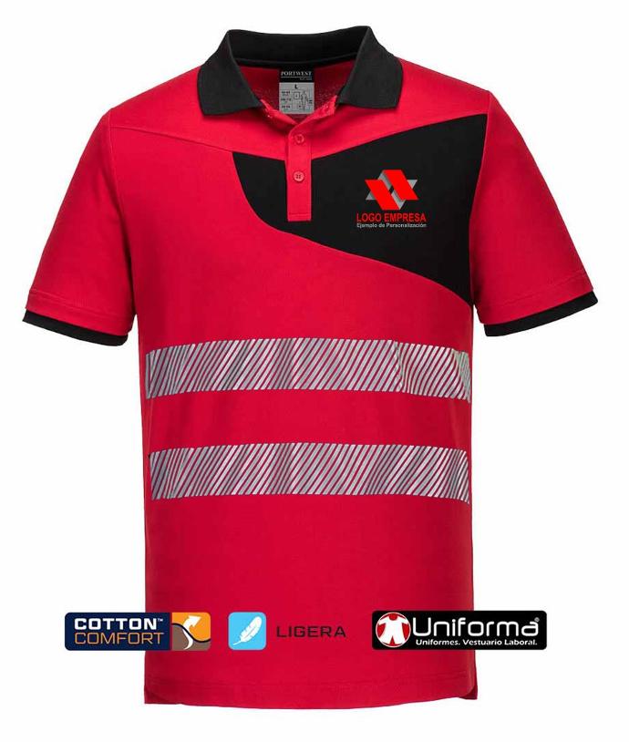 Polo de trabajo en tejido ligero de Poliéster algodón de 145 grms en tejido de calidad premium, para combatir el calor, personalizable con logo de empresa a todo color en diversas técnicas, así como con bandas reflectantes o de alta visibilidad del tipo segmentada discontinuas para mejor transpiración y comodidad: